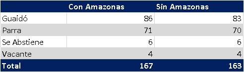 Por otro lado, si Guaidó hubiera caído por debajo del umbral requerido de 84 votos, probablemente habría invocado la disposición sobre el voto electrónico, aprobada el 17 de diciembre, que permite a los legisladores emitir votos virtuales. Estimamos que esto le habría dado 9 votos adicionales, llevando su mayoría a 95 votos (92 sin Amazonas).
