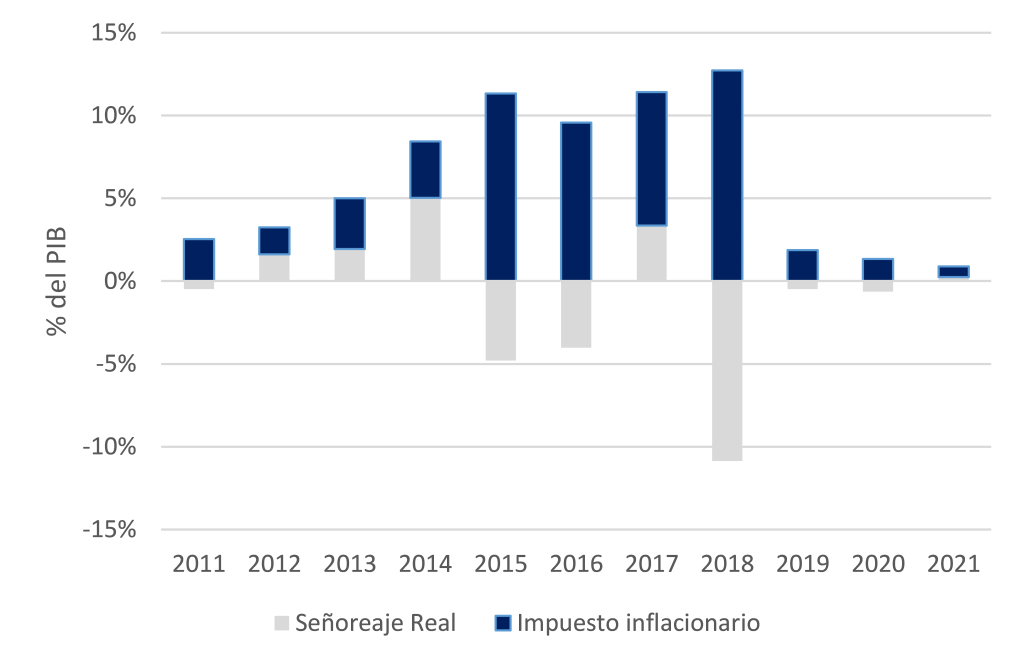Governments can reap significant levels of revenue from printing money. As Table 3 shows, at its peak in 2017, seigniorage contributed 11.4% of GDP to the government budget, thus paying for 28.5% of public sector expenditures. Of course, this also means that the amount that is being extracted from contributors (i.e., holders of assets denominated in local currency that lose value because of inflation) is huge, creating sizable incentives to avoid this tax. The simplest way to avoid the tax is, of course, by holding and using as little local currency as possible. In other words, an increase in inflation leads to declines in the demand for money which themselves undermine the capacity of the inflation tax to be used as a source of financing government expenditures.