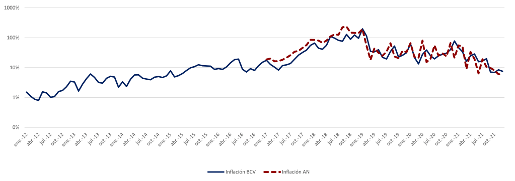 [2] The BCV and 2015AN-OVF series have shown significant differences in the past. For example, the 2015AN’s estimate of 2018 inflation of 1.7 million percent was more than 12 times higher than that published by the BCV, of 131 thousand percent. However, on the timing of hyperinflation, they appear quite similar, with a difference of one month at the start and two months at the end of the phenomenon. The recent behavior of the series is similar as well: both series have put Venezuelan monthly inflation in the single digits for the past five months (from September 2021 to January 2022), with the 2015AN-OVF data showing a smaller average print for this period (6.6%) than the BCV (7.3%).