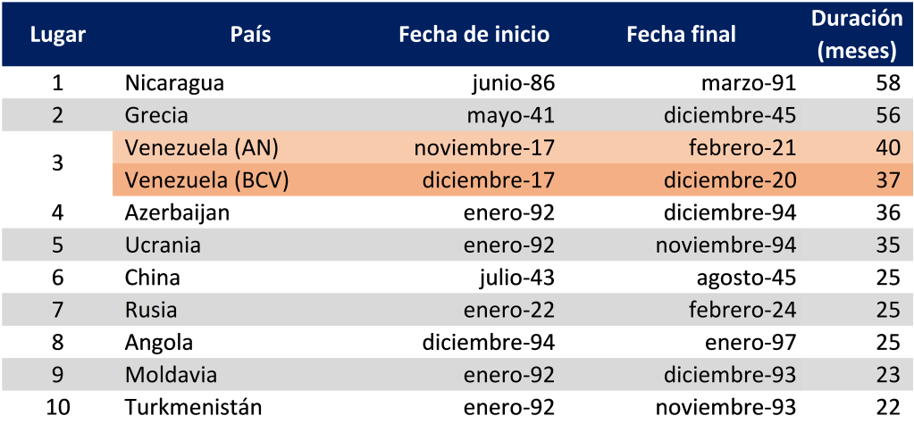 Regardless of what data you prefer to use to measure Venezuelan prices, it is clear that the country is no longer facing the traumatic monthly triple-digit price rises that it saw towards the end of 2018. Venezuela’s hyperinflation thus lasted 37 months according to the BCV data, or 40 months according to the 2015AN-OVF series. Either figure makes it the world’s third-longest documented hyperinflation, after Nicaragua (58 months) and Greece (56 months) (see Table 1)[2].